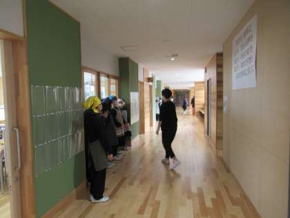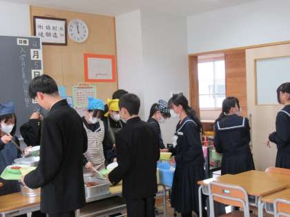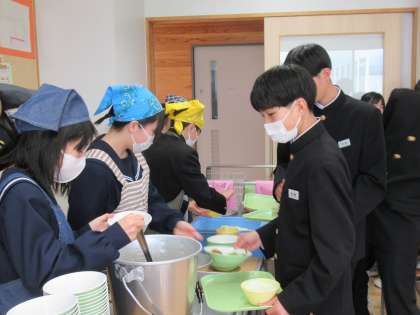 新しいクラスでの初めての給食。給食当番もはりきっています。