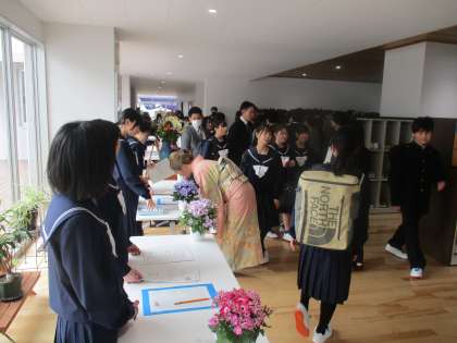生徒玄関で、受付をしています。