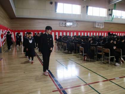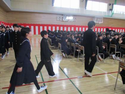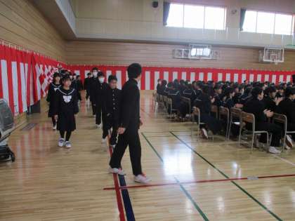新入生127名の入場です。今年度は、3年生の誘導で1組から順に入場しました。