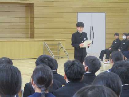 全校生徒が整列した後、生徒会執行部の紹介と生徒会長による入会歓迎の言葉がありました。