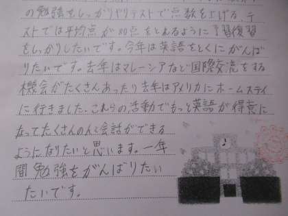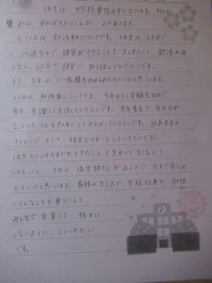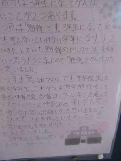 3年生は、「勉強」を頑張りたいと書いている生徒が圧倒的に多いですね。受検を意識しています。「思い出」をつくりたい、チャレンジしたいと、校長先生や担任の先生の話をしっかり受け止めている生徒も多いです。