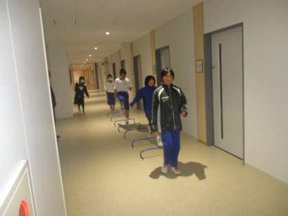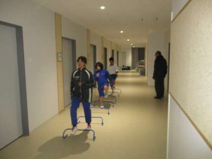 陸上競技部はミニハードルトレーニングに取り組んでいます。