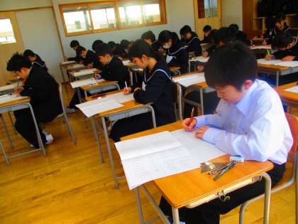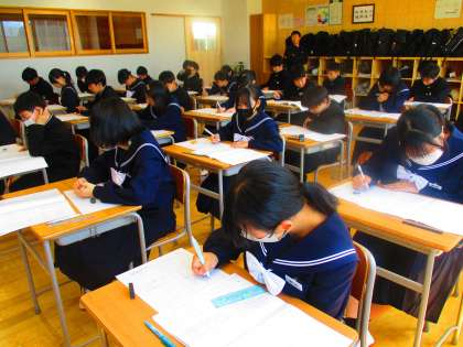 1年生は、1限目に担任から「テストの受け方」についての説明を受けました。これからたくさんの「定期考査」や「学力調査」を受けることになります。テストを受けるときの注意事項をしっかり守って、2限目の国語の問題に取り組んでいます。