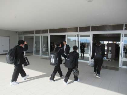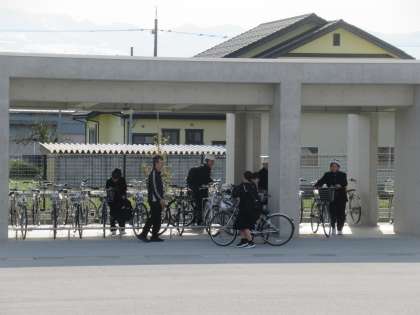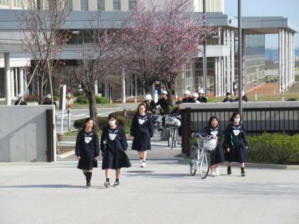 風が吹いていますが、元気いっぱいに自転車で登校してきました。
