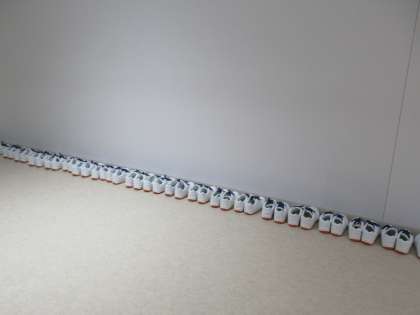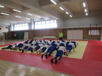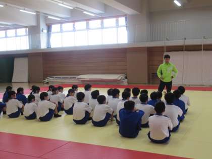 保健体育では、整列や点呼、トレーニングについて説明を聴いています。柔剣道場前には、びしっと内履きズックが並んでいます。