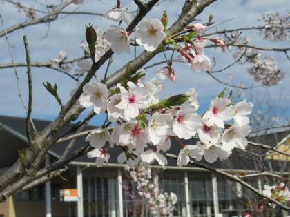 「八尾のニワ」(通称:前庭)の桜がようやく満開を迎えました。井田川の向こう岸の桜の木は咲き誇っています。八尾中の桜はまだ学校と同様、3年目なのでボリュームはありませんが、本校の桜の木なりに精一杯頑張って花を咲かせています。いとおしいです。