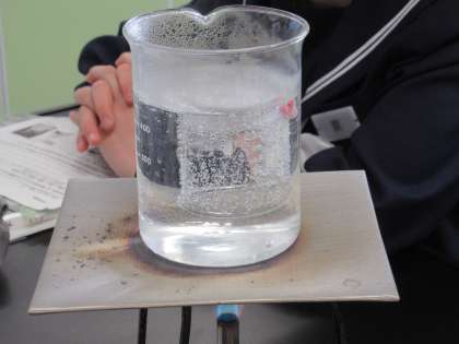 水が入ったビーカーの中に、小さいビーカーが逆さまになって入っています。これを沸騰させるとどうなるか、という実験をしています。