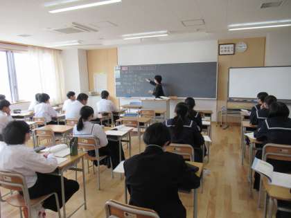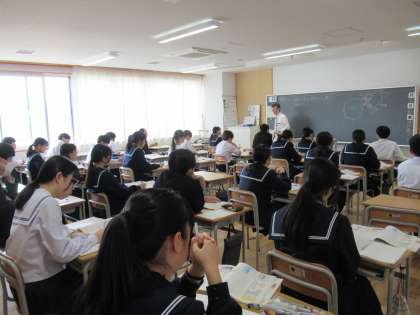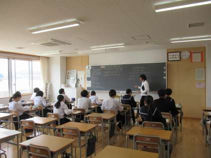写真上・中は、数学の授業の様子です。2クラスに分かれて、少人数指導を行っていきます。単元によって、教科担任が交代します。