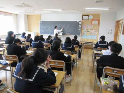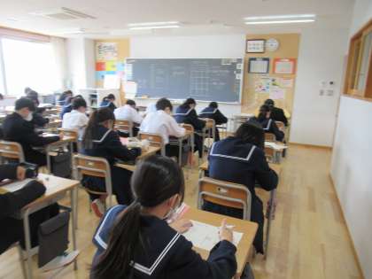 写真上は、理科の授業の様子です。中教研学力調査の解説中です。