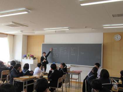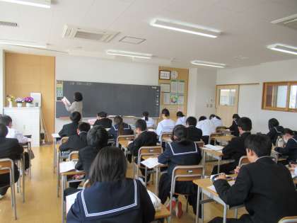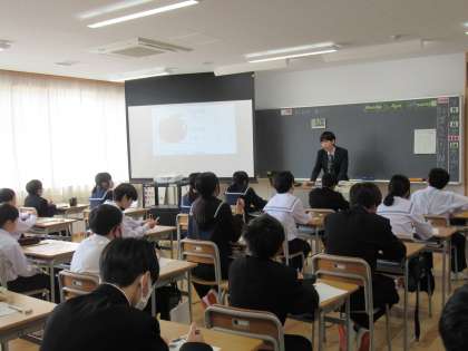 写真上は、家庭科の授業の様子です。オリエンテーションをビンゴクイズで行っています。