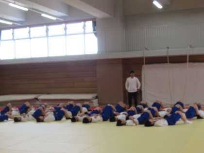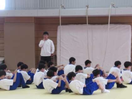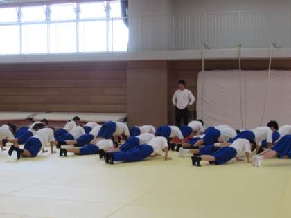 腹筋や腕立て伏せを行っています。かけ声をかけながら、頑張っています。