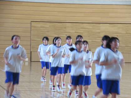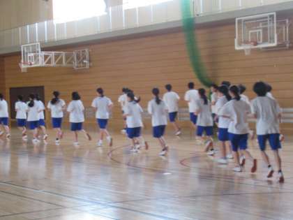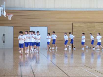 体力づくりとして、15分間走をしています。一周ごとに、先頭を交代し、ペースをつくっていきます。渡り鳥の飛行と似ていますね。