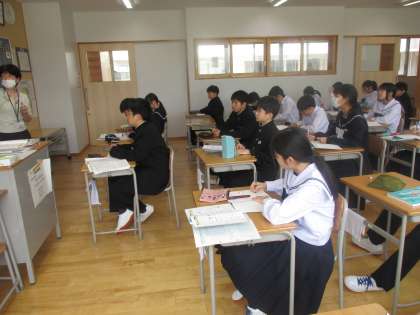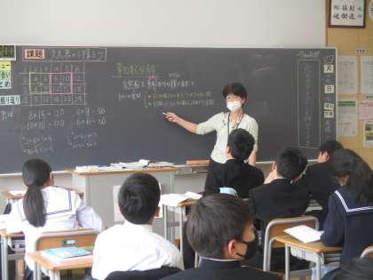 1年2組の「数学」の授業です。今日は「素因数分解」について学習しています。「素因数分解」とはある数を、「素数」だけの積で表すことです。まずは、「素数」についてしっかり学習しています。