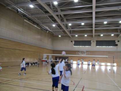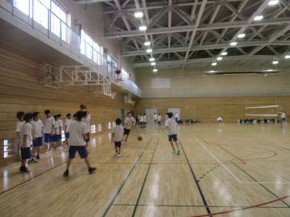 体育館では、バスケットボール部とバレーボール部が元気よく活動しています。
