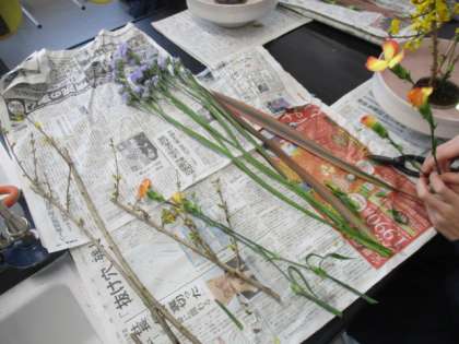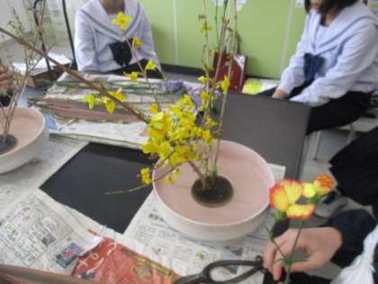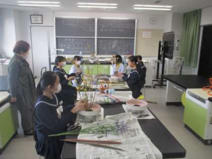 華道部は、講師の先生に指導していただいています。1年生も取り組んでいます。