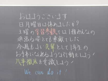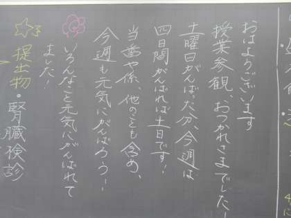 週開けの朝は、黒板メッセージが書いてあるクラスがいくつかあります。