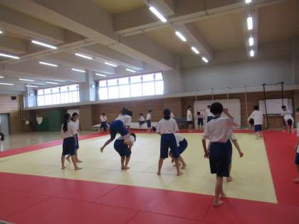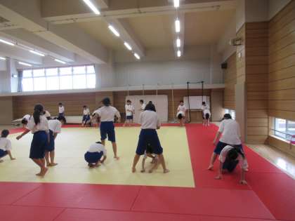 ペアになって馬跳びをしたりしながら体づくりをしています。