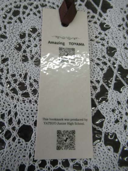 語り部さんに、本校と富山市のQRコードを付けた、桂樹舎さんの和紙で作ったしおりを託しました。八尾中、八尾、そして富山市をPRしました。