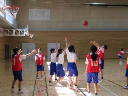 試合形式でバスケットボール競技に取り組んでいます。なかなかシュートが決まらず苦戦中です。