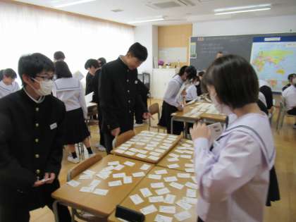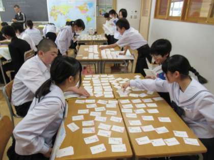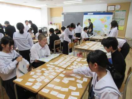 先生からのヒントでカードを取ります。ヒントは緯度と経度。生徒は、地図を片手に必死です。楽しみながら、緯度と経度を学んでいます。