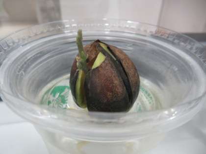 職員室前で育てているアボカドの種から根が生えてきて久しいですが、ようやく芽が伸びてきました。葉を付ける日が楽しみですね。