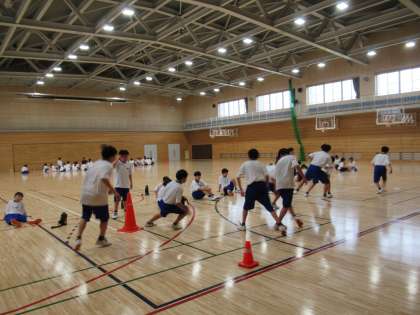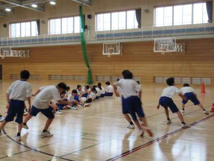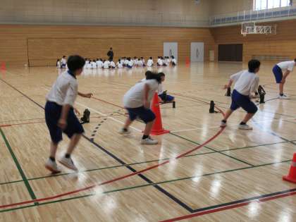 ペアで回数を測定しながら、何回も反復横跳びにチャレンジしています。