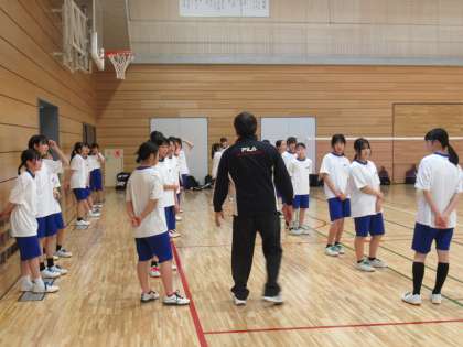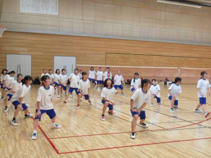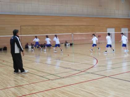 女子バドミントン部は、顧問の先生から基礎練習の指導を受けています。
