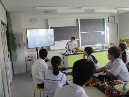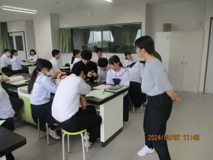 「牛乳」や「モンダミン」などの日常生活で使う液体について、電流が流れるか確認し、流れた場合は、どの成分が影響しているかについて班で考えています。