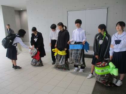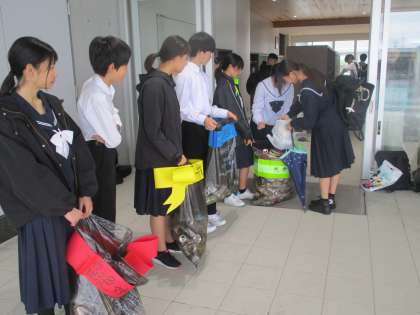 生徒会執行部では、昨日に引き続き生徒玄関前で「空き缶回収」を行っています。昨日の昼の放送で呼びかけた効果もあり、たくさんの生徒が家から袋を抱えて空き缶を持って来てくれました。