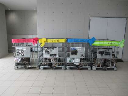 生徒玄関前に置かれた4色の空き缶回収かご。昨日は緑団が多かったようですが、今日は何団が多いかな。