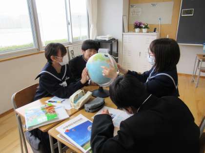 グループで、振り返りプリントに取り組んでいます。実際に、地図帳や地球儀を見ながら答えを導き出しています。
