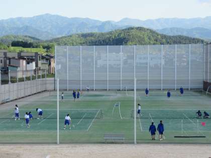 テニスコートでは、ソフトテニス部が練習に励んでいます。