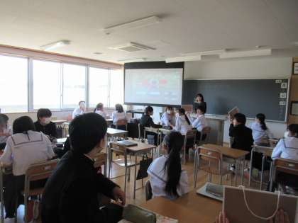 スクリーンに映し出される民族衣装を見て、どこの国の人かを当てています。班対抗で楽しみながら学習をしています。