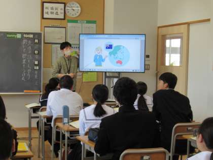 写真上は、英語の授業の様子です。絵を見ながら先生の質問に英語で答えています。