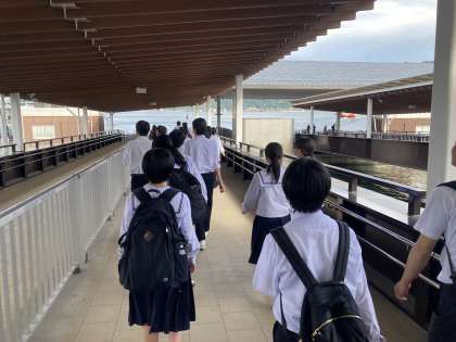 フェリー乗り場に到着しました!遠くに見える鳥居に生徒は大興奮!
