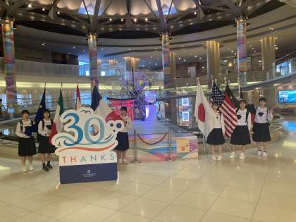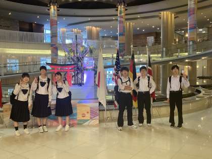 エントランスの、G7教育大臣訪問で撮影された撮影スポットでハイチーズ!気分は大臣!