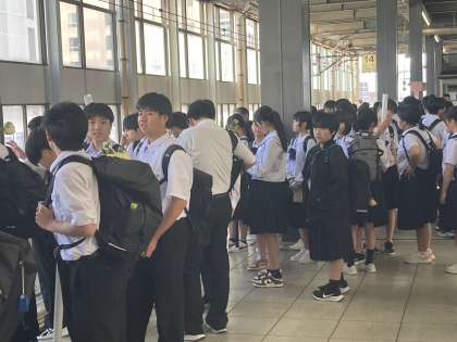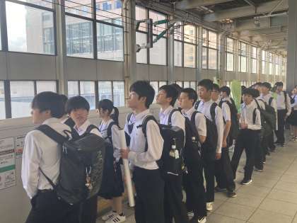 5月16日(木) 3年生 修学旅行 2日目 新幹線で新大阪へ その1 公開日 2024/05/16 更新日 2024/05/16 八尾中学校のページ ホームへ移動し、乗車隊形で新幹線を待っています。しゃくやくとポスターを握りしめています。