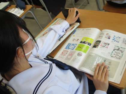 美術の授業です。いろいろな都道府県の特徴をデザインした図や文字を見ながら、どんな意味があるのかみんなで考えています。