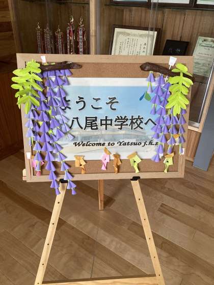 生徒玄関前のウエルカムボードにも花が付いています。