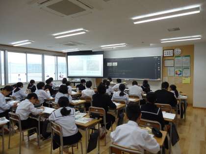 写真上は、社会の授業の様子です。「氷河時代の日本のようす」について学習しています。