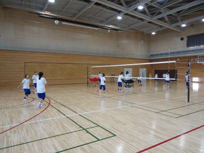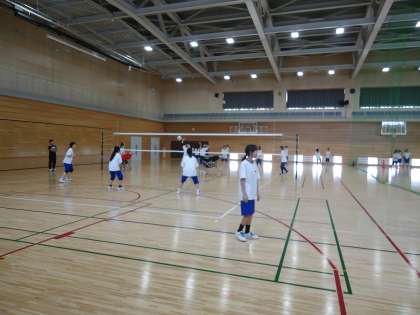 体育館内では、バレーボール部が練習に励んでいます。たくさんの部員で活気づいています。