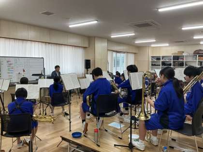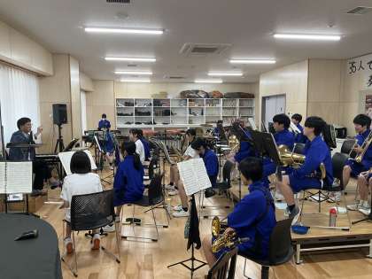 吹奏楽部が指揮に合わせて、よい音が出せるように練習しています。