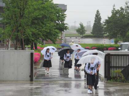 駐輪場で雨具を脱ぐ生徒が多いですが、雨具を着たままで生徒玄関まで来ると濡れませんよ。