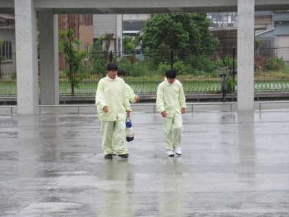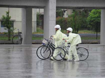 雨の日は自転車通学生がぐっと減りますが、その中でも雨具を着用してたくましく自転車で登校してくる生徒もいます。