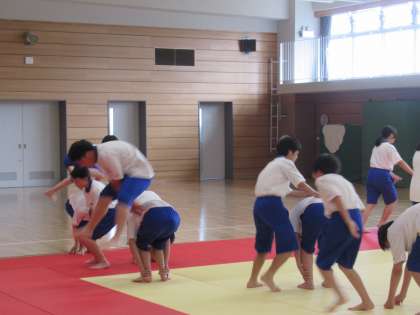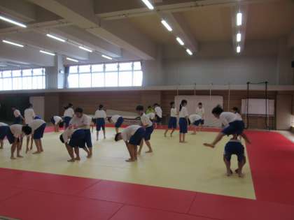 柔道場で体づくりをしています。ペアで馬跳び中です。