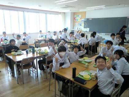 4限が終わると素早く給食の準備に取りかかります。そして、班のみんなで楽しく給食を食べます。みんな笑顔です。