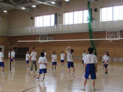 オーバーヘッドパスの練習をしています。ペアで、20回続けることを目標に頑張っています。