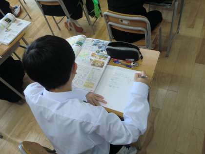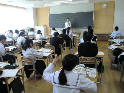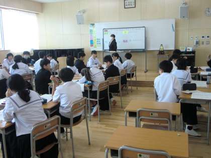教科書や資料集を開いて真剣に先生の話を聞いています。グループ学習で意見交換しながら学習を進める場面もあります。