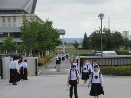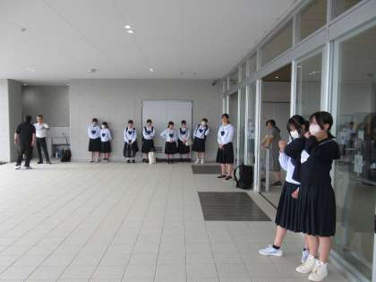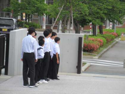 今朝のあいさつ運動は、3・4組4班です。門のところと生徒玄関前とに分かれてあいさつ運動を行っています。