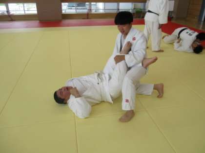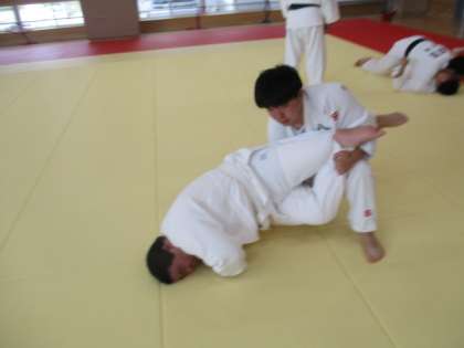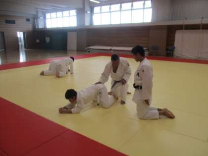 柔道部は寝技の稽古に励んでいます。地域の講師の先生に指導していただいています。